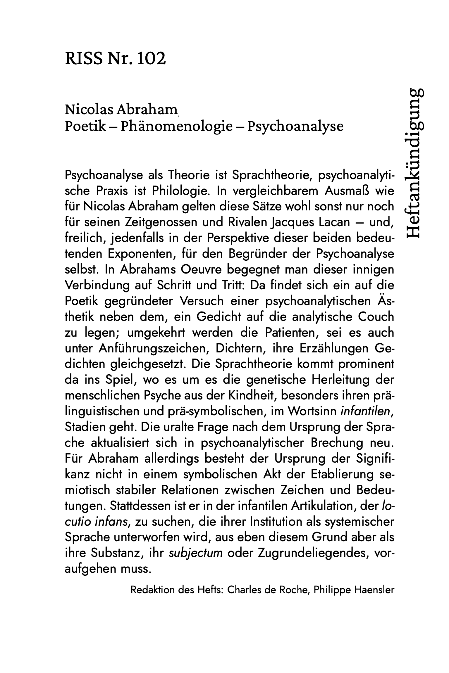 Die nächste Nummer des RISS widmet sich Nicolas Abraham, insbesondere seinen frühen Schriften, in denen phänomenologische Fragestellungen noch besonders maßgeblich und konturiert erscheinen. Aus dem Editorial der Herausgeber, Charles de Roche und Philippe Haensler: „Psychoanalyse als Theorie ist Sprachtheorie, psychoanalytische Praxis ist Philologie. In vergleichbarem Ausmaß wie für Nicolas Abraham gelten diese Sätze wohl sonst…